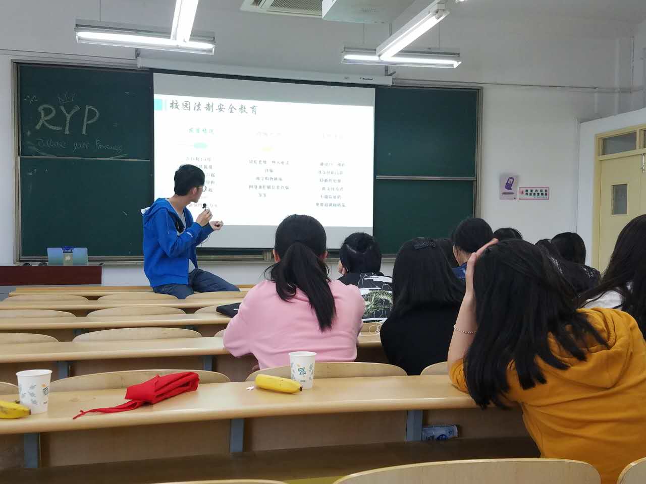 2016年5月17日星期二下午15点45分,旅游会经15级全体学生在辅导员沈嘉斌老师的主持下在2教104开展了有关校园法制安全教育的大班会。班会旨在增强学生的安全意识和法律意识,提高同学们的自我保护意识。
