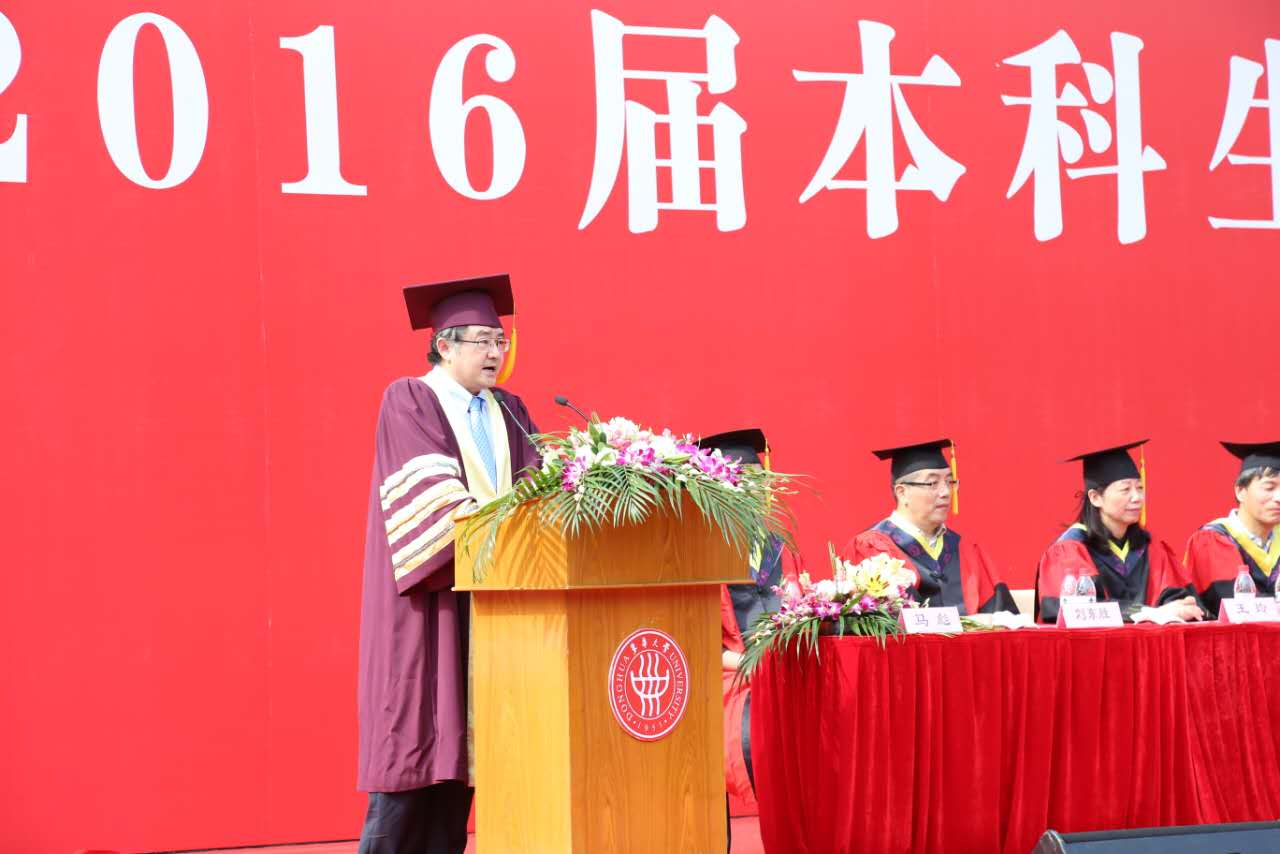 蒋昌俊校长在毕业典礼上致辞,围绕着“志”“众”“勤”“学”四个字表达了对毕业生的殷切期盼。蒋校长首先对服装设计与艺术学院多年来培养优秀设计人才及彩民之家 长期以来的创新人才培养的成绩表示肯定及鼓励。并进一步指出东华学子应以中华民族伟大复兴为己任,坚信我们的毕业生能承载着国家和学校的期望,发挥所长、奉献社会、建功立业。在送给毕业生的四字寄语中,蒋校长提到古人所说“得其大者兼其小”,引出对毕业生在“志”方面要立志高远,持之以恒的要求;通过对李克强总理“大众创业,万众创新”的解读,鼓励毕业生在“众”方面做好万众之一、服务社会、实现人生价值;引用韩愈的名言“业精于勤荒于嬉,行成于思毁于随”激励毕业生们在“勤”方面勤于思考,勤于实践;在“学”方面,期望毕业生能保持求知的欲望,谦逊好学,丰富内涵。最后表达了对东华学子传承东华文化的期盼并为现场所有毕业生送上毕业祝福。