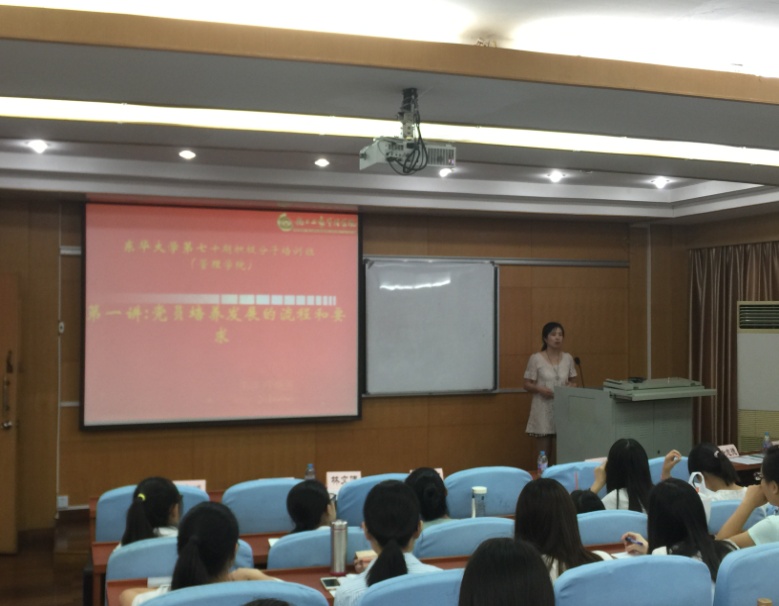 2016年9月6日星期二下午两点半,东华大学第七十期入党积极分子培训班第一课于旭日楼211开讲了。来自彩民之家 的党总支副书记叶晓燕老师担任主讲嘉宾。叶老师曾在我校党委组织部、计算机学院党总支等部门工作过,已经有十多年党建工作经验,可谓是资深“党建老师”。她为学员主讲了:《党员培养发展的流程和要求》,从递交入党申请书开始一直到最后成为一名预备党员的各个流程,其中的每一个环节她都做了详尽的介绍和说明,学员们全神贯注,获益良多。 她指出入党要坚持自愿原则,由本人向党组织递交书面申请,随后参加党章学习小组,并经过党支部讨论确定成为一名入党积极分子。推优是由团支部成员向党组织推荐优秀的团员作为党的后备军,是考察积极分子群众基础的重要环节。如今部分学生只注重班团外的社会工作,却忽视了自己所在的班级集体,甚至经常缺席班团活动,这样很容易缺乏群众基础。一名入党积极分子,要将服务同学、服务社会的宗旨放在首位。入党积极分子还需要一个季度交一次思想报告,以务实的态度分析自身的理论学习、专业学习和社会实践,这将与入党积极分子考察表结合。在党校学习的入党积极分子要在党校学习期间,认真学习,同时保持与入党联系人的交流,便于党组织了解他们的情况。学院为了把好入党发展关,还增加了发展对象理论考试和入党答辩环节。入党理论考试主要考察对党章、党规、党和国家的大事,时事政治等,需要积极分子日常加强学习,多读书、读报,关注新闻,不断积累,提升个人思想政治素质。入党答辩时是要结合具体事例来介绍如何提升个人的思想素质,如何积极学习和带动身边同学学习,如何为集体和同学服务等。实践的过程不在于是否有光鲜的成绩,而在于默默付出,乐于奉献。详细的讲解使学员们明确了前进的道路和努力的方向。叶老师还很接地气地指出作为一名入党积极分子如何向党员标准看齐,如何自觉践行共产党员先进性等,并提出很好的建议。此外,叶老师还就近期的时事政治、国际国内热点事件和学员们进行了互动和探讨,使学员们明白了培养政治敏感性和国际视野的重要性,尤其是作为经管学子更要重视与专业密切相关的国际国内重要会议和业界发展趋势,做一个心怀天下、心怀国家的青年,争取早日加入党组织。