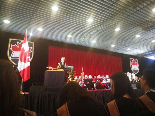延续着英联邦学位授予的传统,与国内由院长拨流苏代表授予学位不同,卡尔顿大学是由学院院长为台上的学生披上知识带代表授以学位。这让第一次参加卡尔顿大学毕业典礼的中国学生无不感到新奇而又激动。卡尔顿大学的毕业典礼不仅承载着学校历史的传承,承载着对学生学习的肯定,也承载着对毕业生未来的深深祝福。尤其是每当院长念到一位学生的名字时,会场后排的家属区就爆发出一阵阵的欢呼声和喝彩声。整个会场的气氛顿时嗨了起来。