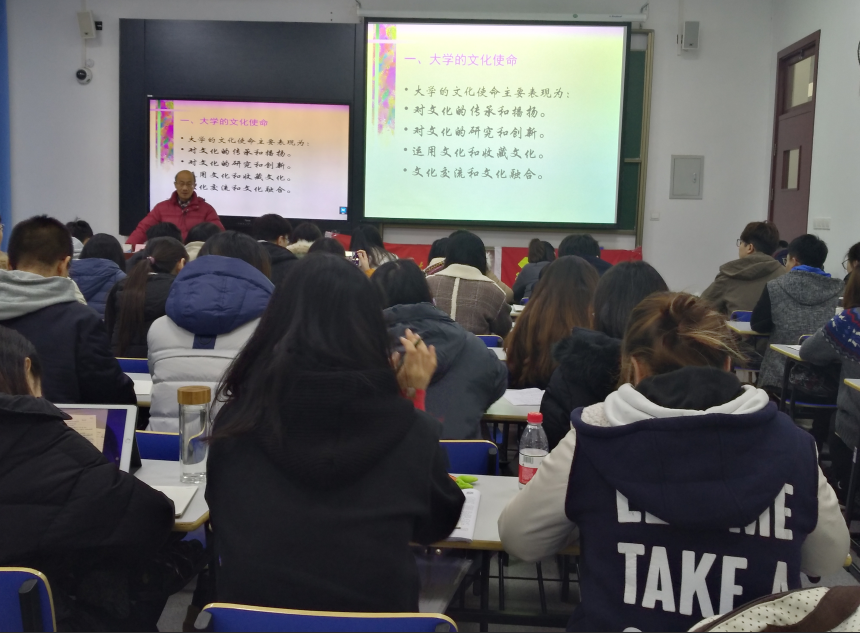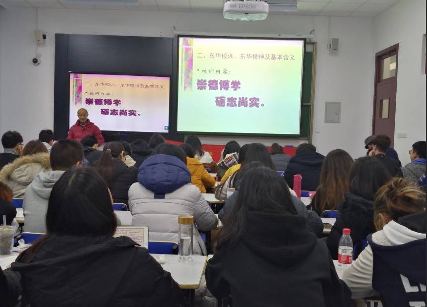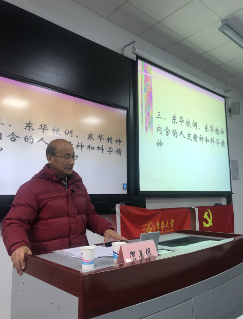 2018年12月11日,东华大学彩民之家 2018年预备党员培训班学员在一教210聆听了一场主题为“东华校训与东华精神”的党课。主讲人关工委讲师团成员贺善侃教授从东华的校训和东华的精神出发,深入探究和剖析校训的文化起源和内涵,鼓励每一位东华人践行东华精神,做杰出东华人。贺教授生动又深刻的演讲,让每位学员对东华校训和精神有了更深的解读。 本次报告分为五个部分,分别是大学的文化使命、东华校训和精神的基本含义、东华校训和精神内含的人文精神和科学精神、校训和精神的历史底蕴以及践履东华精神、做杰出东华人。