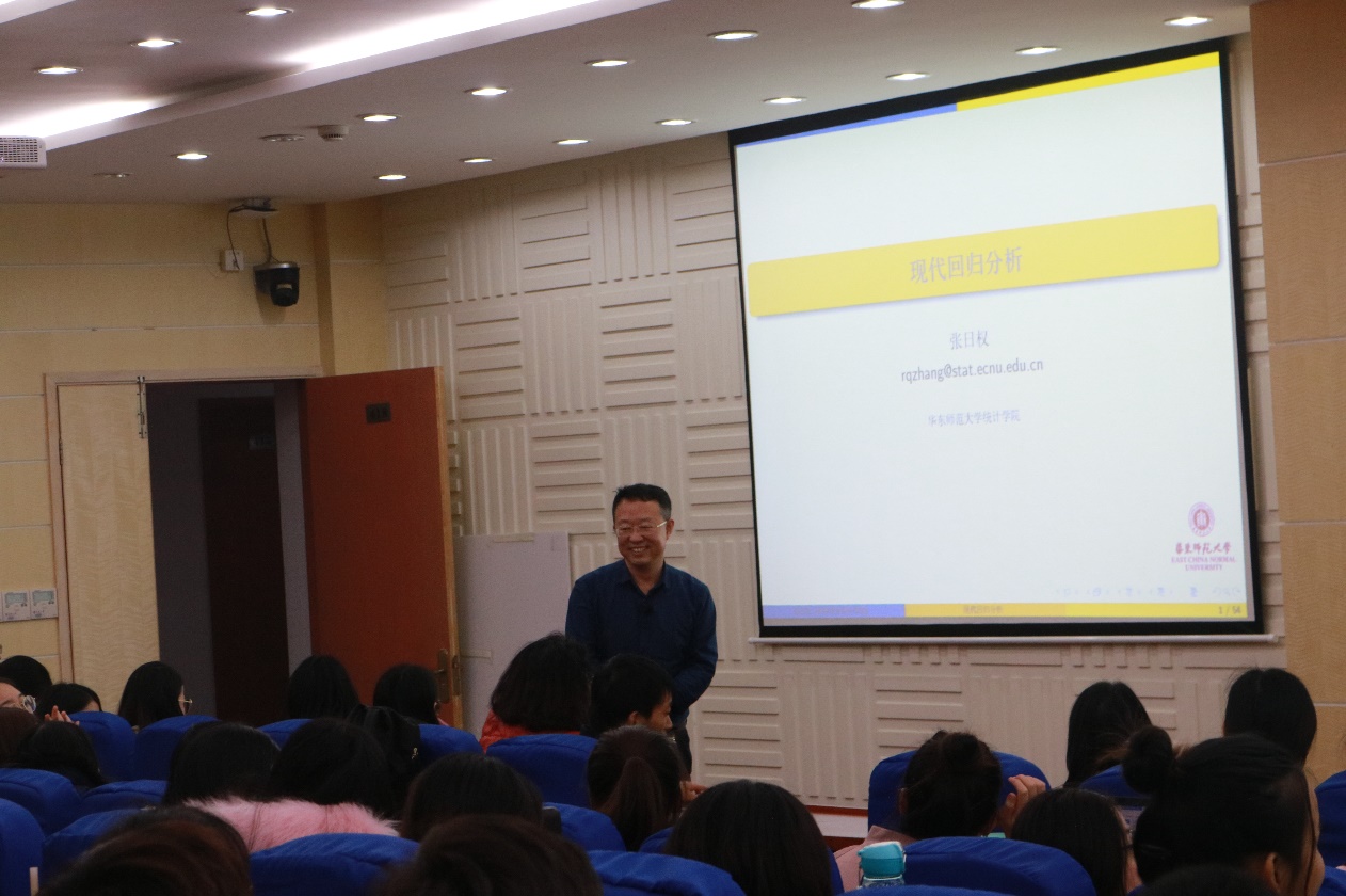 2018年12月13日(周四)16:00,华东师范大学统计学院张日权教授为彩民之家 师生进行了一场以“现代回归分析(综述)”为主题的学术报告会。报告会在旭日楼418教室举行。 首先,张教授以空气污染对呼吸疾病的影响作为例子引出回归分析的来历,应用统计方法来将定性研究转向定量研究,介绍了常用的统计方法——回归模型,来研究变量之间相关关系。 接下来张院长着重介绍了几种传统和新型的回归模型,详细介绍了其建模过程,其中重点介绍了变系数部分线性模型(Varying-Coefficient Partially Linear Regression Model),该模型由张院长于2008年研究莺落峡水流的时候提出,指出进水量与放水量存在非线性关系,放水量同时也会受温度和湿度的线性影响。 其次,张院长针对三类不同的模型分别介绍其对应的估计方法。参数模型——常用的估计方法有最小二乘法、极大似然方法;非参数模型——对于存在位置函数的模型可使用泰勒展开式进行线性估计,也可以应用傅里叶基进行函数展开来估计;半参数模型——通过固定位置参数,转化为参数模型进行估计。