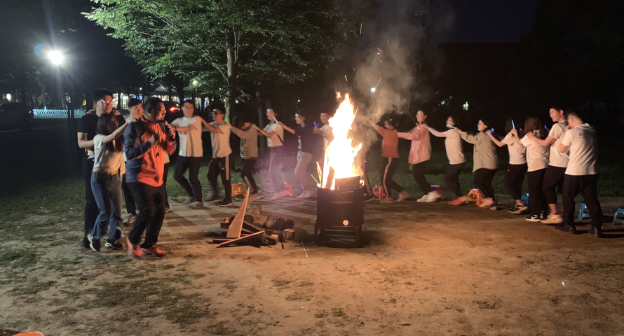 篝火晚会:相信篝火晚会是给同学们留下最深刻印象的活动。在新教练的带领下,同学们跳了1小时有余的舞蹈,长蛇穿门,群魔乱舞,小小的场地,充满着大大的欢乐。经过一天的劳累,同学们在篝火晚会尽情挥洒汗水,没有丝毫的慵懒,密切的合作与新颖的创意,相信班干们也舞出了工商彩民之家 高水平人才应有的风采。