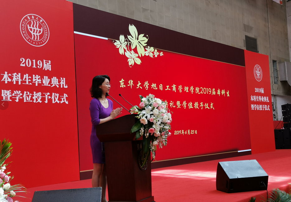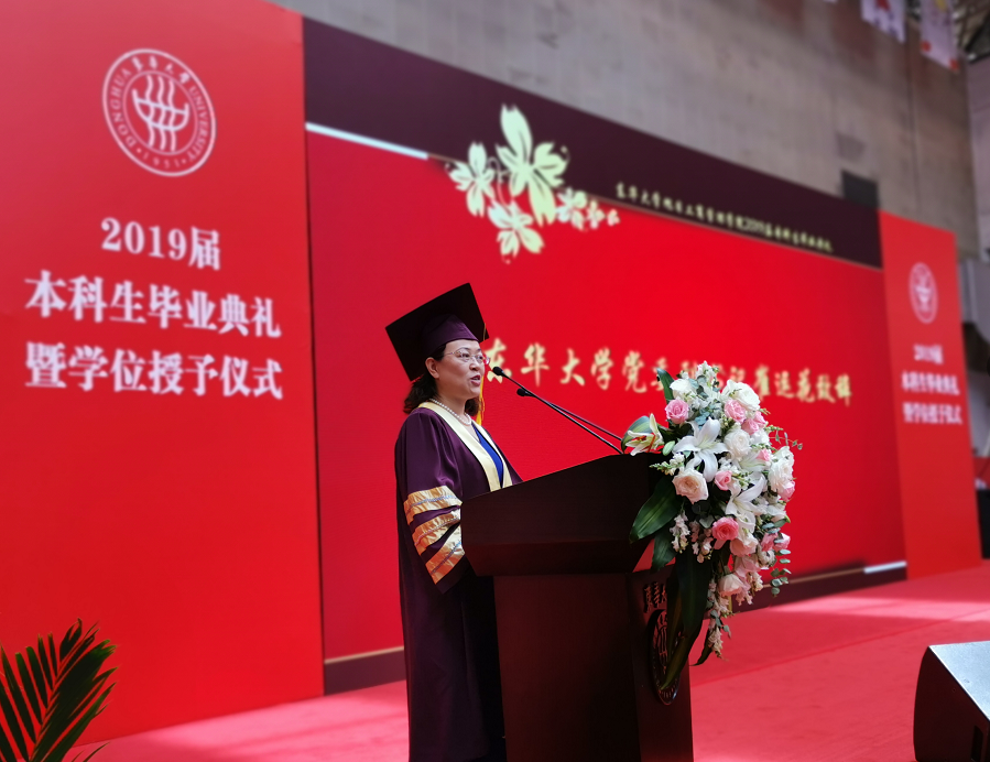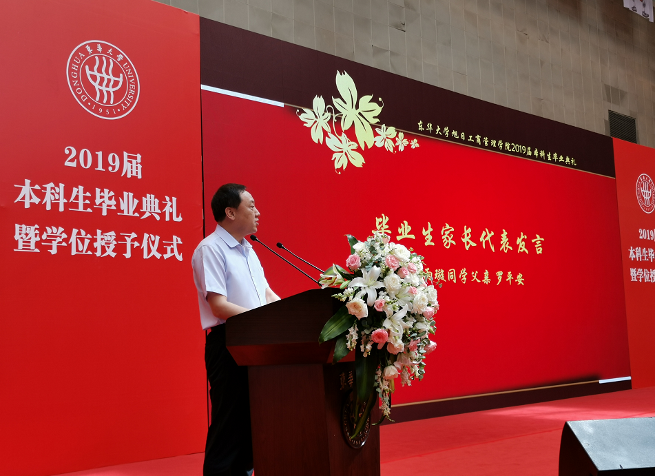 在毕业生家长发言环节,罗雨璇同学的家长感谢了东华大学四年来对女儿的栽培,表达了对2019届本科毕业生的热烈祝贺,并向为同学们的成长倾注热情、汗水和智慧的老师及校领导们表示衷心的感谢。现场还与同学们分享了几点人生感悟,如树立终身学习的理念,同时培养独立思考能力和独立人格,还要敢于坚定信念,追求自己所爱的事情。愿毕业生们奋勇拼搏,愿东华桃李芬芳。