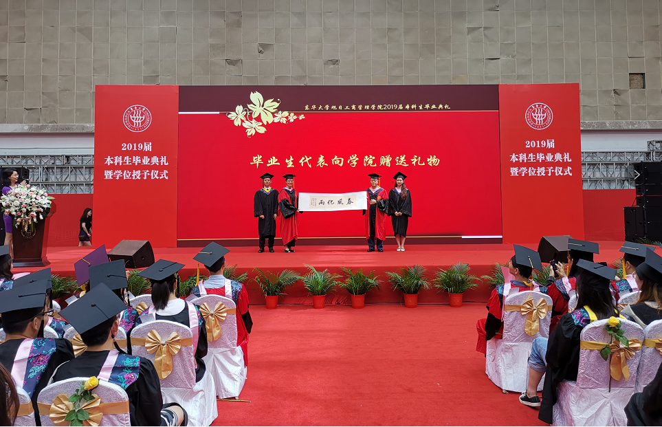 在毕业生代表发言环节,2019届毕业生代表黄雯雯带领同学们一起回顾了大学四年的成长轨迹。黄雯雯同学深刻感受到,“崇德博学、砺志尚实”的校训时时刻刻鞭策着每一位东华学子爱校荣校、崇尚学术、追求卓越、敬业奉献。“严谨、勤奋、求实、创新”彰显着东华人的精神面貌。四年间,她收获了青春最美的回忆,收获了亲密无间的友谊,拥有了强烈的责任感,培养了勇敢追梦的自信,也学会了对生活充满感激。最后,她满含深情地感恩母校的悉心培育与老师们无微不至的呵护关怀,也祝愿所有毕业生们前程似锦,祝愿母校枝繁叶茂。发言结束后,毕业生代表徐智坤同学向学院赠送了礼物。
